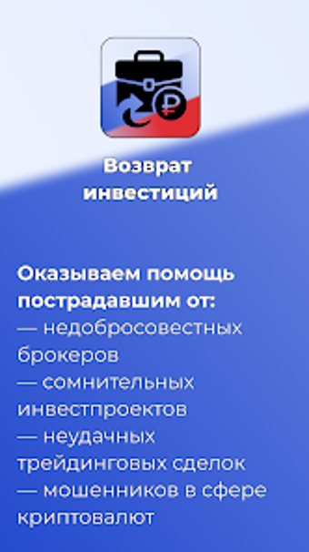 «Возврат инвестиций» is een gratis Android-applicatie die zich richt op individuen die slachtoffer zijn geworden van financiële fraude. Deze tool biedt ondersteuning aan gebruikers die zijn benadeeld door valse brokers, cryptoscams, en andere vormen van bedrog in de financiële sector. Met interactieve tools en stap-voor-stap instructies helpt de app slachtoffers om hun kansen op compensatie te begrijpen en biedt het nuttige aanbevelingen.